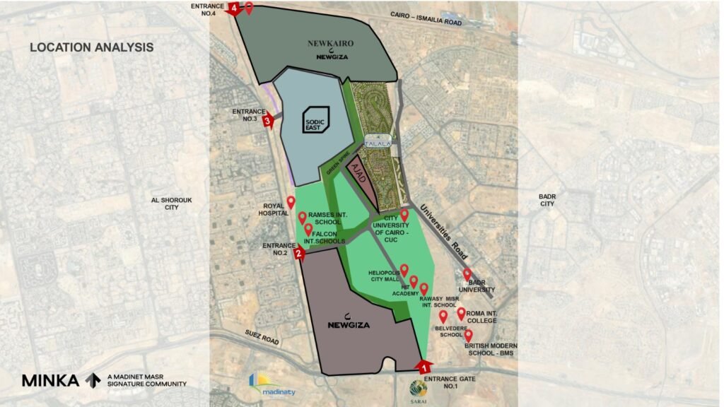 المشروع مقام على مساحه 500 فدان هليوبوليس الجديدة على بعد 10 دقائق من كمبوند سراى, بجوار كمبوند سوديك ايست والبروج
